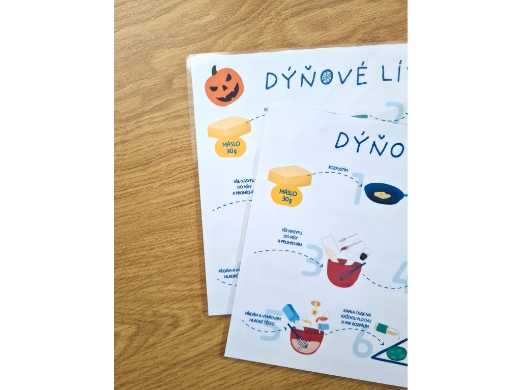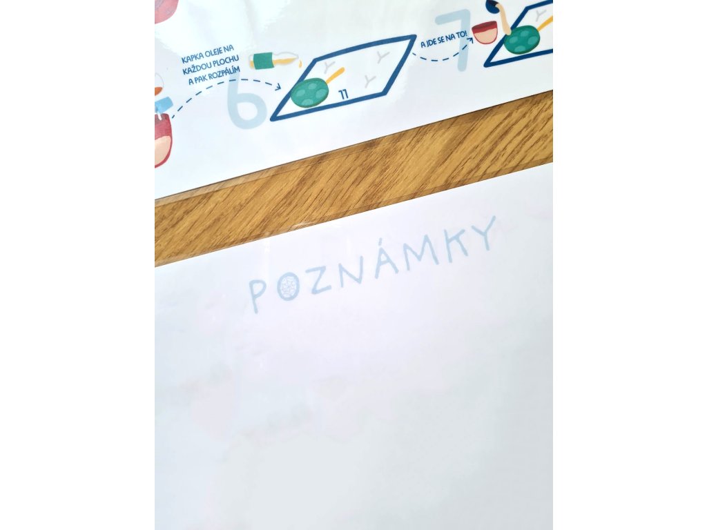 Malovaný, přehledný recept krok za krokem, který je navržený tak, aby mu porozuměly i menší děti. Je zalaminovaný, takže vydrží i rozlité mlíko! Na druhou stranu můžete psát fixem na bílé tabule poznámky a ty zase pohodlně smazat.