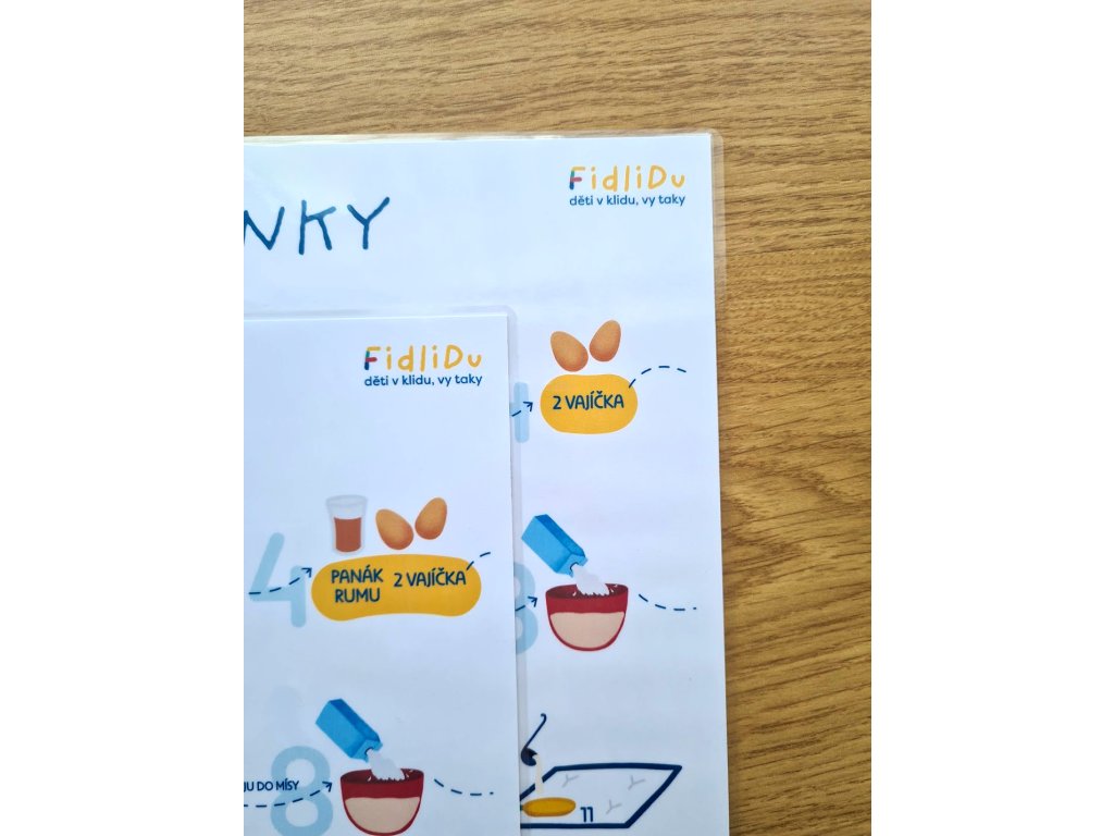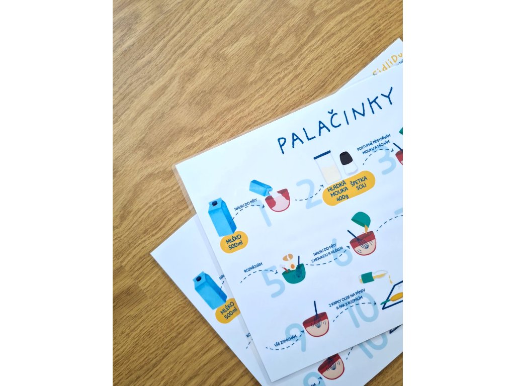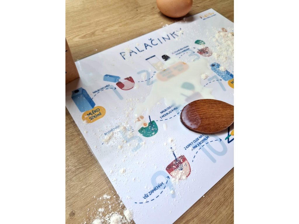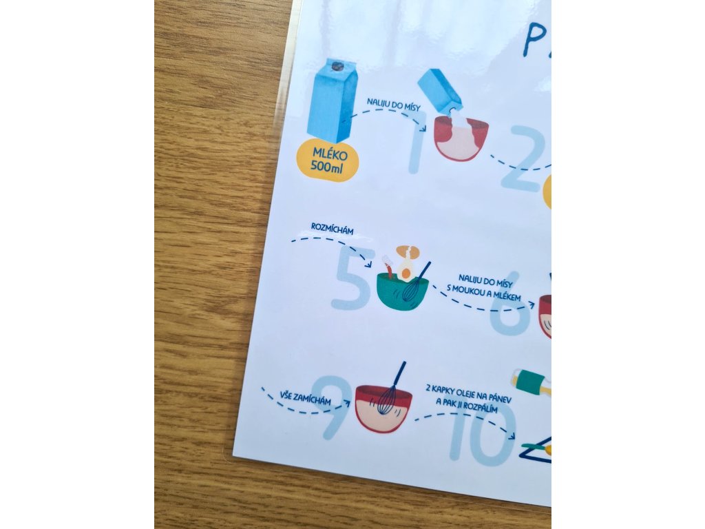 Malovaný, přehledný recept krok za krokem, který je navržený tak, aby mu porozuměly i menší děti. Je zalaminovaný, takže vydrží i rozlité mlíko! Na druhou stranu můžete psát fixem na bílé tabule poznámky a ty zase pohodlně smazat.